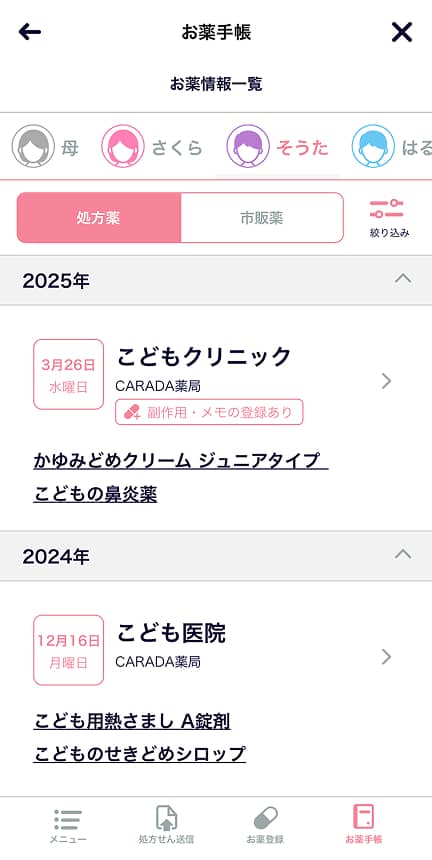 また、お子さまなど家族の薬の記録・管理も可能なため、家族全体の健康サポートにも活用できます。-