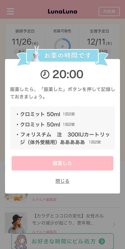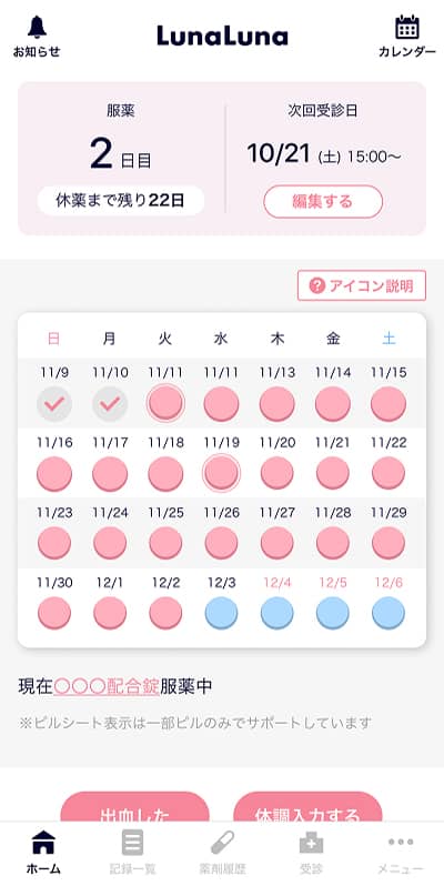 毎日のピルの服薬状況や、体調のちょっとした変化を記録・管理できる機能です。日本国内で処方されている主要な薬剤に対応しており、処方が変わっても記録を続けることができます。また、「ルナルナ メディコ」と連携しているため、マイナートラブルや体調変化に伴う不安の共有など、医師とのコミュニケーションにもお役立ていただけます。