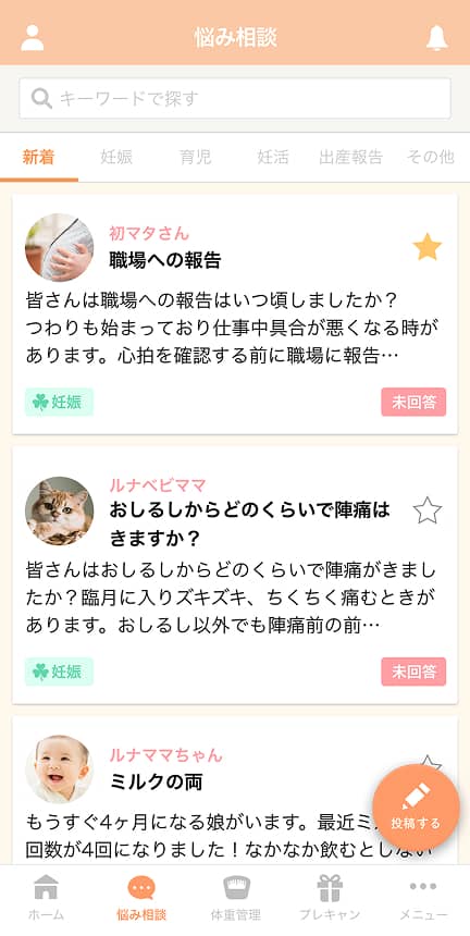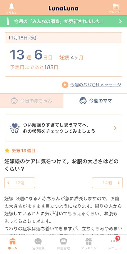 妊娠中・育児中のママ向けアプリです。出産予定日まで赤ちゃんの様子を毎日お届けするほか、妊娠週に応じたママのカラダとココロの状態もお知らせ。妊娠・出産中に役立つ情報やアドバイスを提供しています。