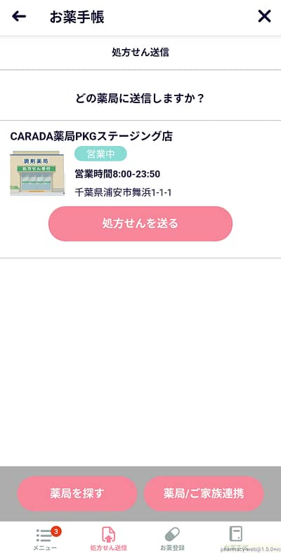 画面下部の「処方せん送信」から、お薬を受け取りたい薬局を選択。受け取り日時を指定することで、待ち時間の短縮にも。